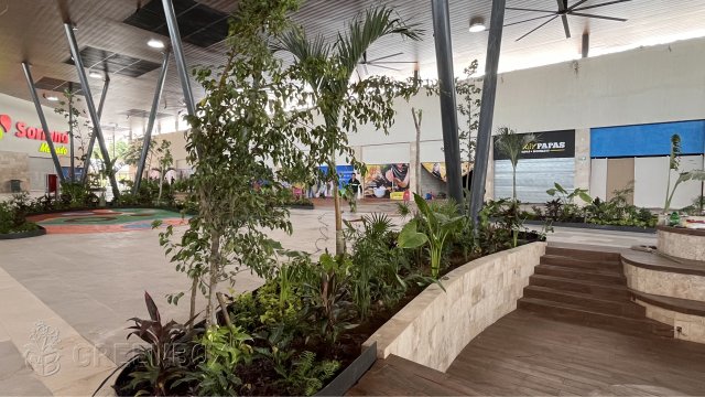 • Selección estratégica de plantas y árboles para generar puntos focales y reforzar la identidad visual del centro comercial.